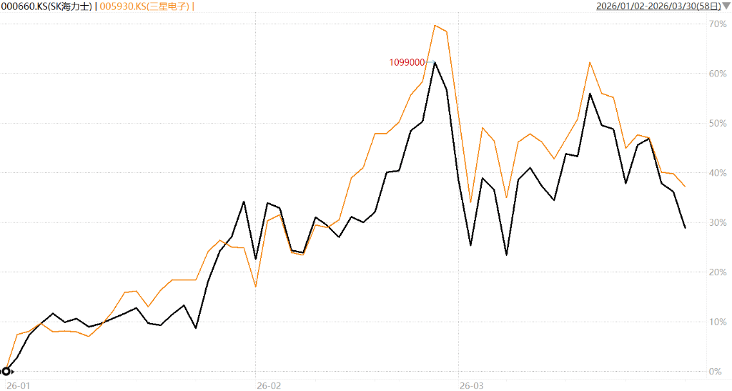SK海力士与三星电子合计占韩国综合股指权重近40%,两只股票遭外资大举抛售,成为此轮跌势的核心。