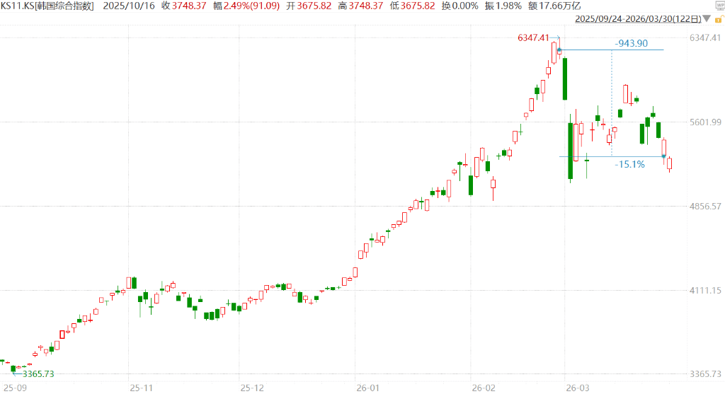 中东战争冲击与芯片需求降温两大压力同步袭来,曾经风头无两的韩国股市正遭遇严峻考验。