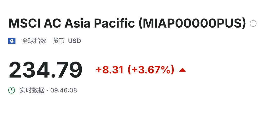 在隔夜美股大幅收涨后,4月1日,亚太股市全线走高,日经225指数最高涨近2000点,涨幅一度超过4%。韩国KOSPI指数涨超6%。同时,韩国交易所盘初于KOSPI 200期货上涨5%后启动KOSPI指数熔断机制,程序化交易暂停5分钟。