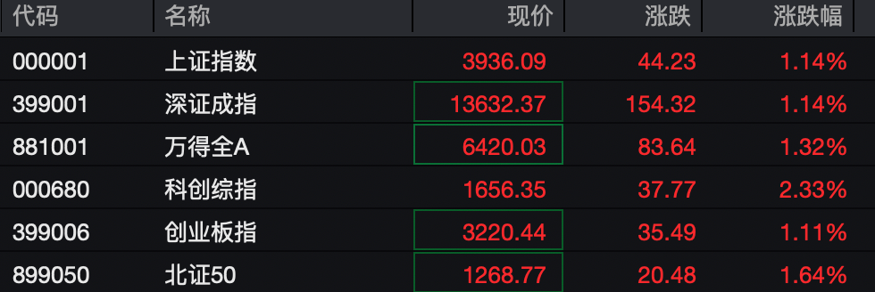 截至发稿,沪指涨1.14%,深证成指涨1.14%;科创综指涨2.33%,创业板指涨1.11%,北证50指数涨1.64%。全A股市场超4700股飘红。