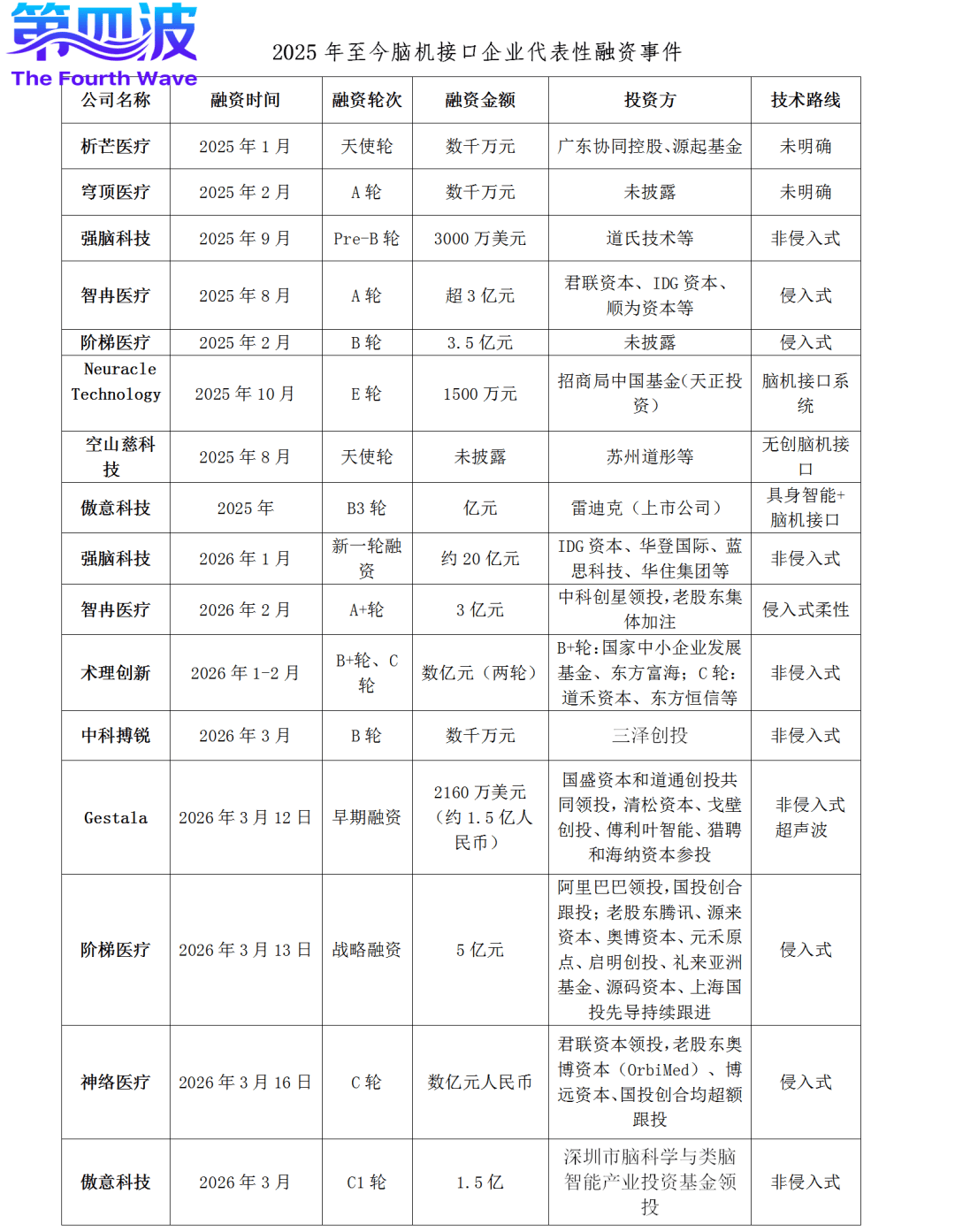 强脑科技开年即获约20亿元融资,是迄今中国脑机接口史上最大单笔融资;格式塔科技完成1.5亿元天使轮融资,刷新该领域天使轮融资最高纪录