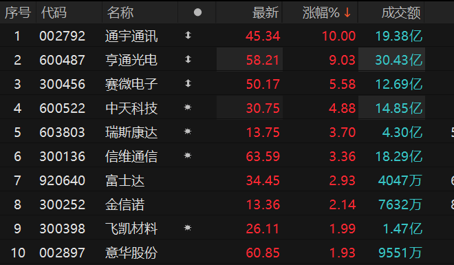 上证报中国证券网讯 4月3日,6G概念盘中走强,截至9时46分,通宇通讯涨停,亨通光电涨超9%,赛微电子、中天科技、瑞斯康达等跟涨。