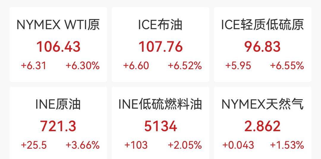 受中东紧张局势升级的影响,国际原油今日持续走高,截至发稿,ICE布油日内涨幅达6.52%,报107.76美元/桶;WTI原油日内涨幅达6.3%,报106.43美元/桶。