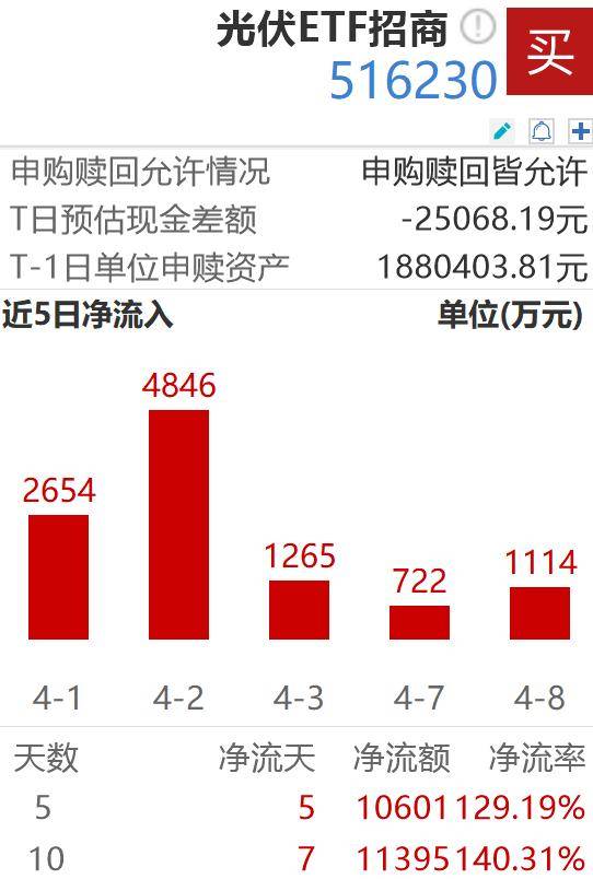 4月9日,美伊冲突再遇滑铁卢,A股市场低开震荡。地缘不确定性下,资金转向布局估值低位、空间向上的新能源板块,光伏ETF招商(516230)连续五日获净流入超1亿元,低吸迹象明显。