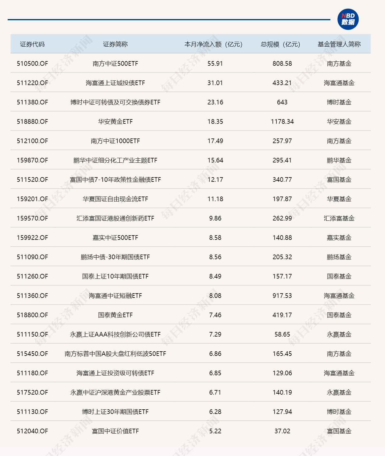 与此同时,南方中证500ETF基金份额减少4.23亿份,净流出额33.69亿元;南方中证1000ETF基金份额减少6.40亿份,净流出额20.30亿元;华泰柏瑞沪深300ETF基金份额减少4.01亿份,净流出额18.36亿元。