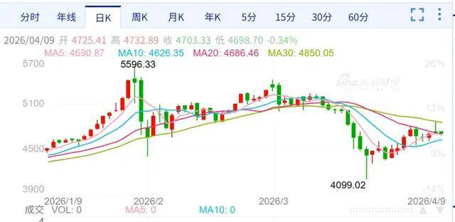 4月1-7日:开启反弹-震荡模式,4月1日涨1.91% 收4758.25美元/盎司,4月2日跌1.71%收4676.86美元/盎司,4月7日再涨1.15%收4701.4美元/盎司,全周波动幅度超3%。