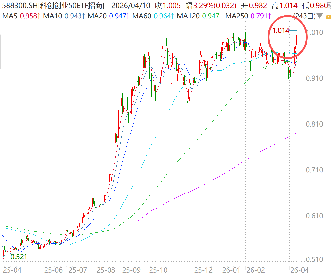 上周市场波动虽在,但前期受外部扰动压制较多的双创与科技成长方向表现亮眼。科创创业50ETF招商(588300)基金净值创下上市以来新高,上周五收涨3.29%、日K强势录得4连阳,成份股中新能源、AI算力、半导体三大主线全面开花。