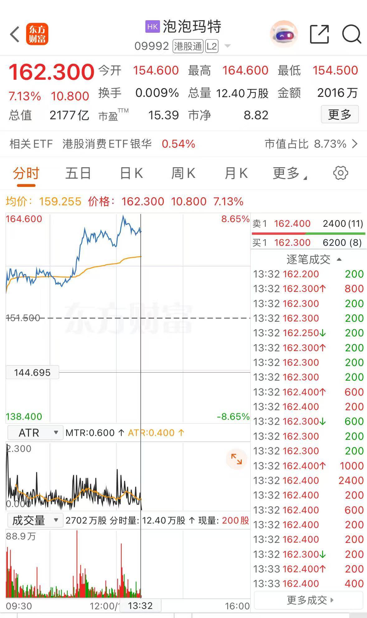 4月14日,泡泡玛特高开,开盘涨2.05%,随后一路走高,盘中一度涨8.65%,报164.6港元/股。截至13时32分,泡泡玛特涨7.13%,报162.3港元/股。