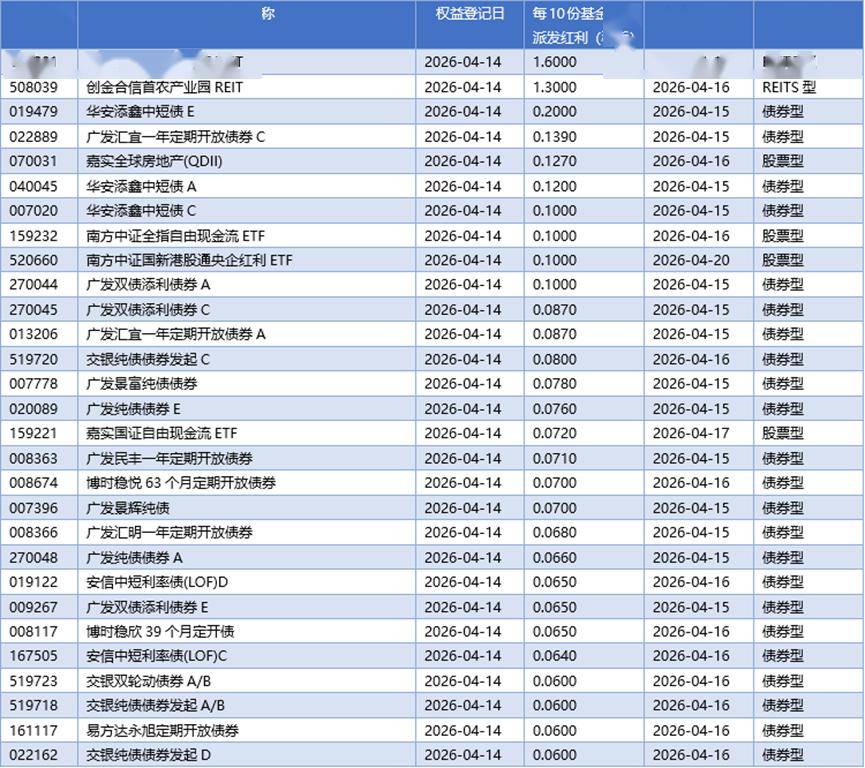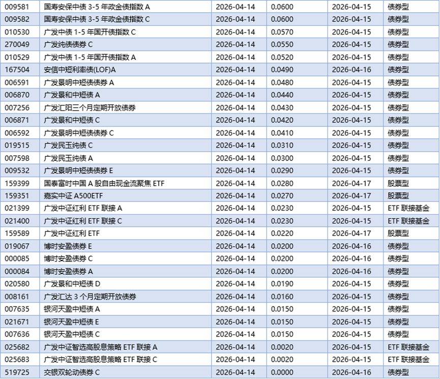 四、04月14日基金分红一览