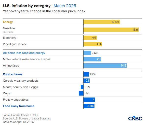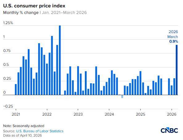 数据显示,3月CPI环比上涨0.9%,同比升至3.3%;但核心通胀(剔除食品和能源)环比仅上涨0.2%,同比为2.6%,仍高于美联储2%的目标,但呈现回落趋势。