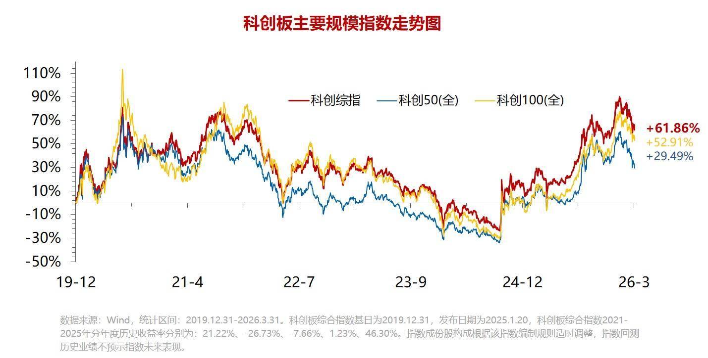 由于科创综指采用“全收益指数”编制方法,将成份股分红再投资计入收益。与其他科创类指数相比,科创综指涨幅更为领先,自指数基日(2019年12月31日)以来截至2026年3月31日,科创综指累计涨幅达61.86%。(数据来源:Wind)