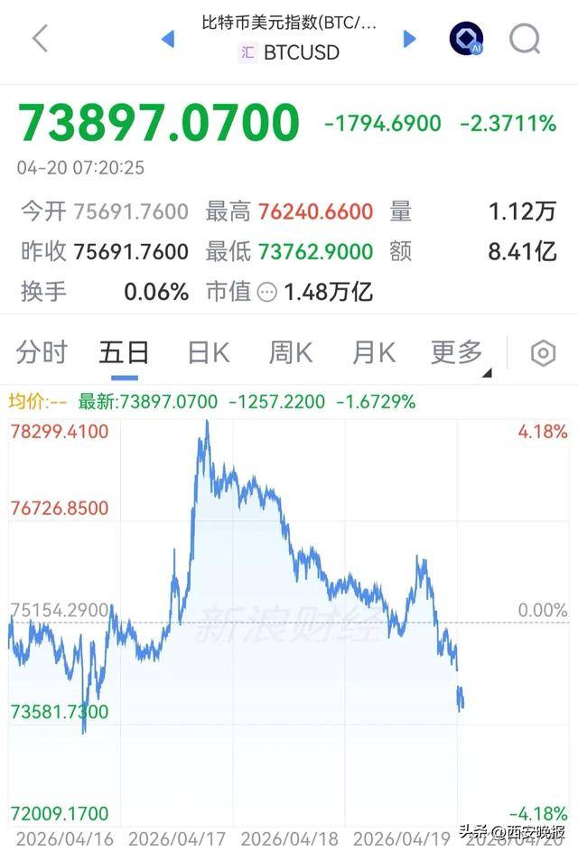 加密货币方面,主要币种集体下挫,比特币跌至7.4万美元附近,日内跌幅超2%。过去24小时,全市场超16万人爆仓,爆仓总额超4亿美元。
