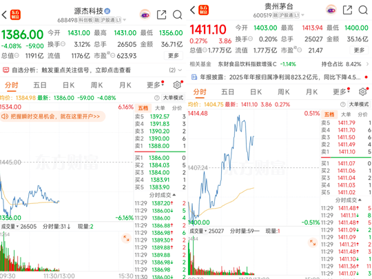 贵州茅台低开高走,截至午间收盘,报1411.10元/股,涨0.27%;上个交易日夺得A股“股王”的源杰科技则低开低走,报1386.00元/股,跌4.08%。