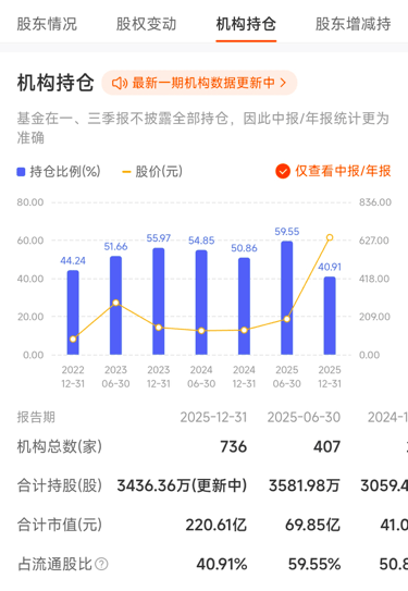东方财富数据显示,截至2025年12月31日,共有736家机构持有源杰科技股份,合计市值220.61亿元,占流通股比例为40.91%;这一数据在2025年年中时,为407家,合计市值为69.85亿元。