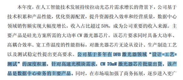 在人工智能技术发展持续拉动光芯片需求增长的背景下,公司数据中心领域销售额实现大幅度增长,收入占比超过50%,成为公司重要的收入来源。主要产品是硅光方案所需的大功率CW激光器芯片。