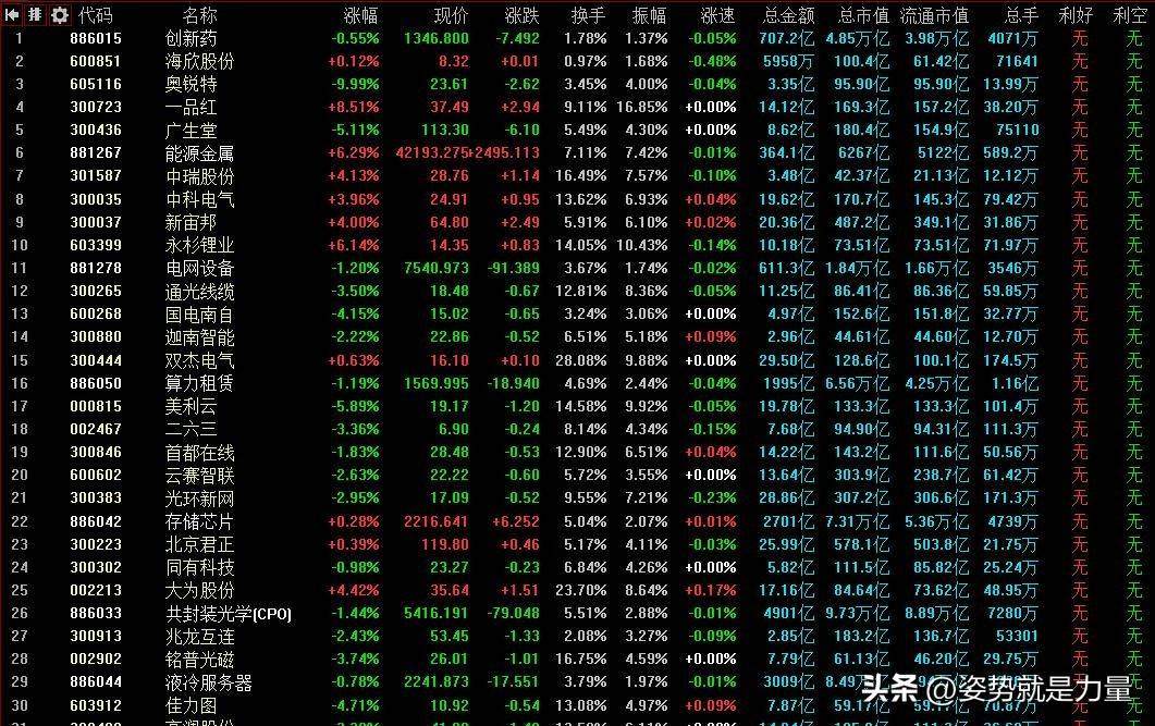 技术上,4月8号起那条上涨通道,上周五正式破了。5日线丢了,10日线现在成了命门,想反弹必须先站回去。可量能缩到2.66万亿,比前两天少了一千六百亿,没人愿意真掏钱。涨得最猛的是能源金属,锂、钴、镍这些涨了6.1%,锂电池全链跟涨,存储芯片也扛住了。不是因为消息好,是锂价一季度涨了22%,业绩摆在这儿,资金认这点实在。