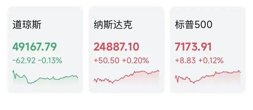 当地时间周一,美股三大股指收盘涨跌不一,道指跌0.13%报49167.79点,标普500指数涨0.12%报7173.91点,纳指涨0.2%报24887.1点,标普500指数、纳指续创收盘新高。